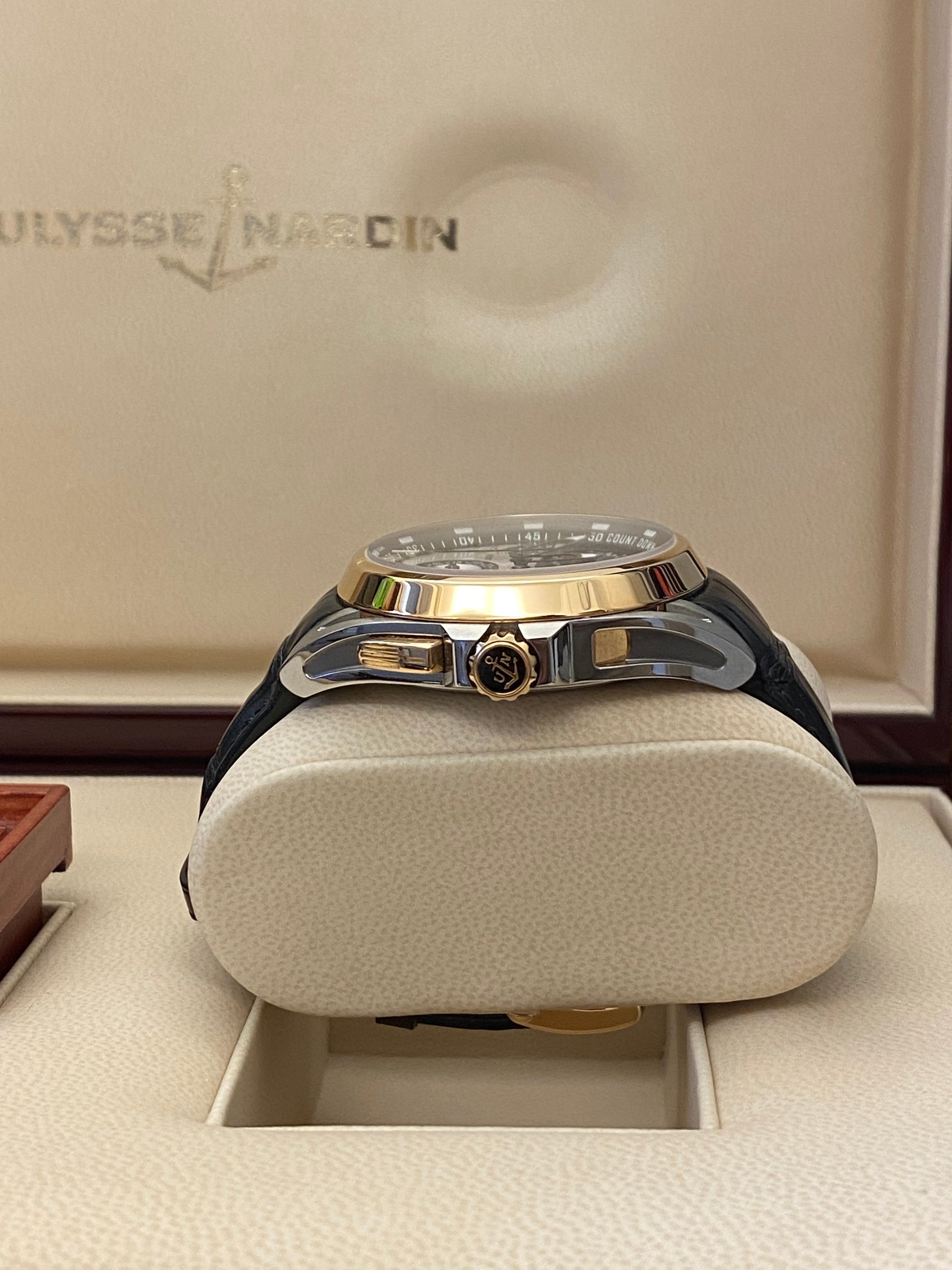 Automatikwerk mit Grossdatum, Kathedralgong-Alarm und GMT, Zifferblatt zweifarbig schwarz und silbern mit Indexen, Titan-/Keramik-/Goldgehäuse auf Lederband mit Faltschliesse original