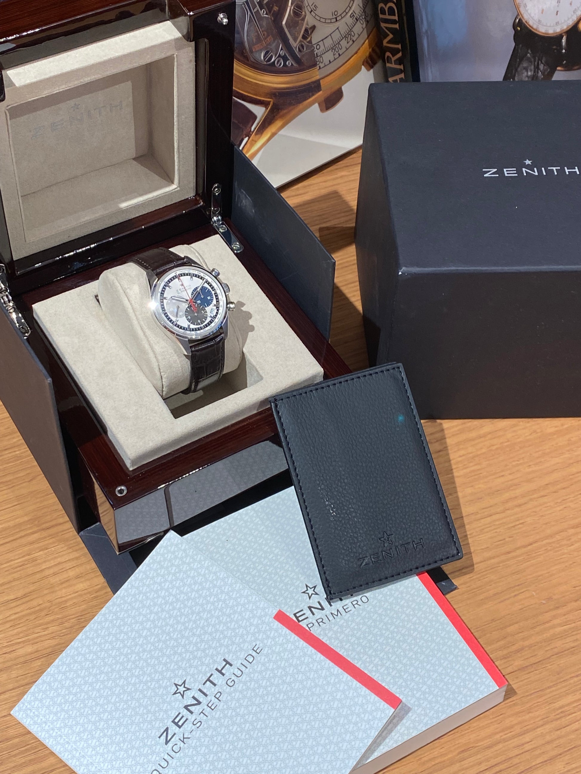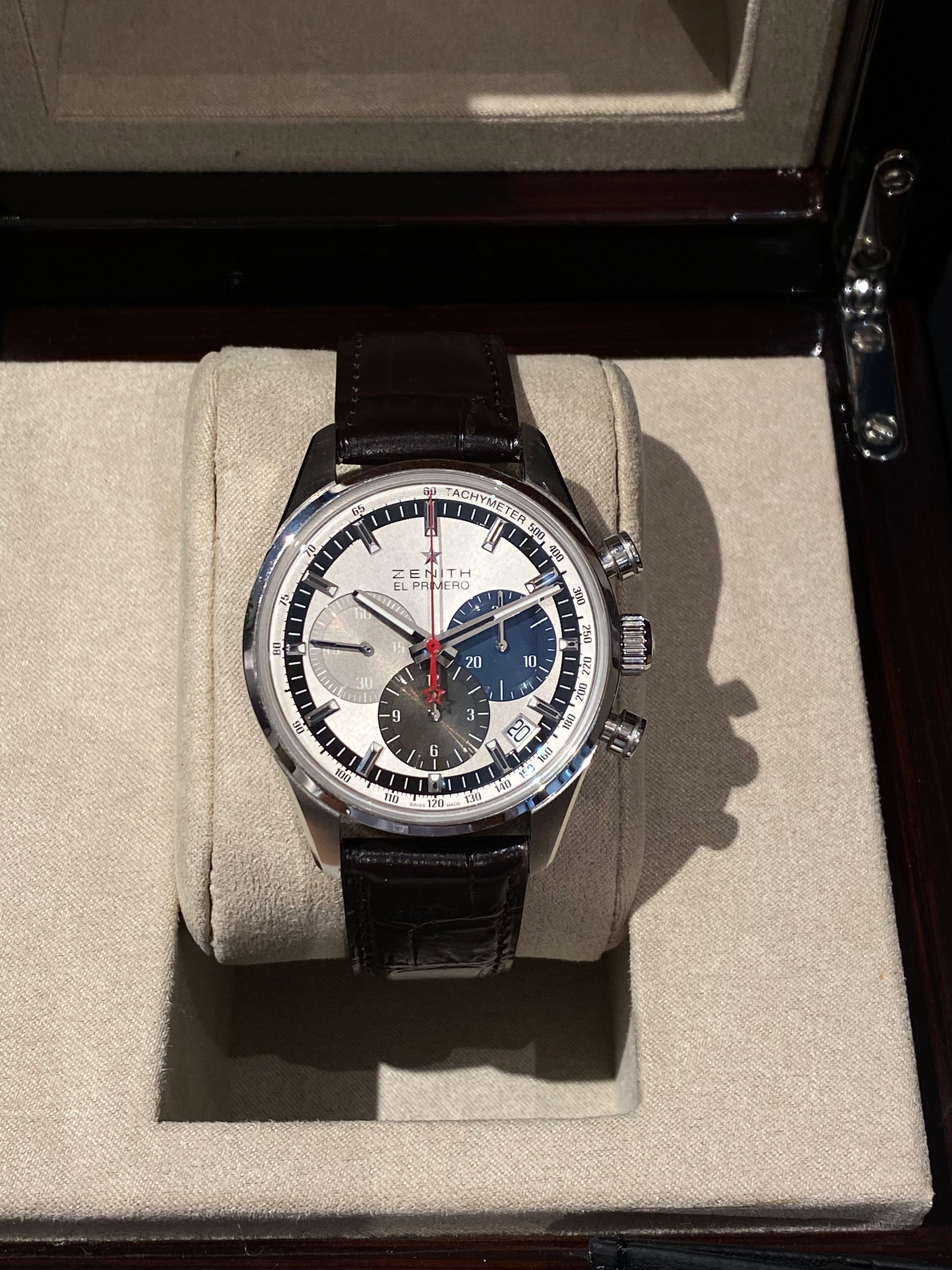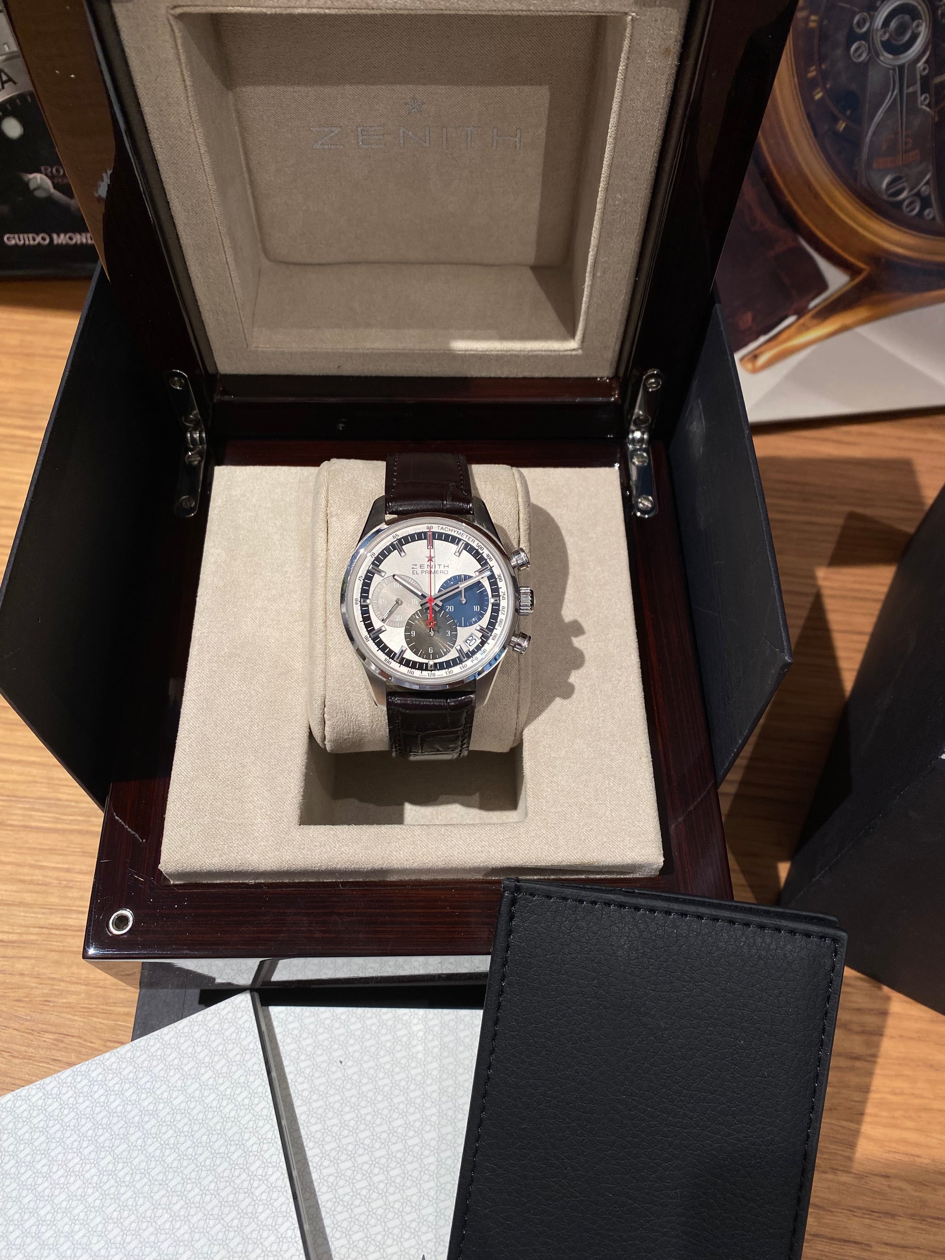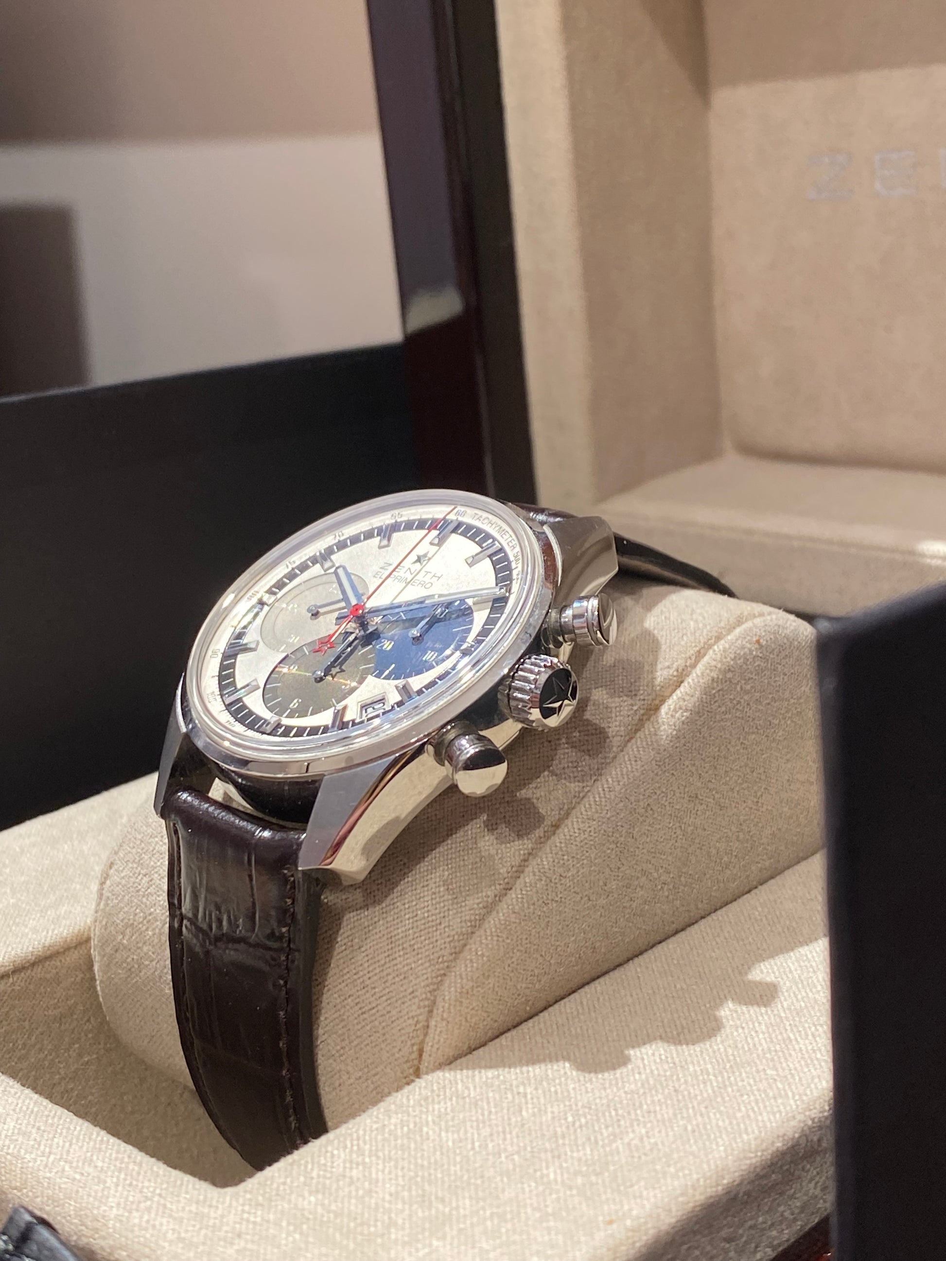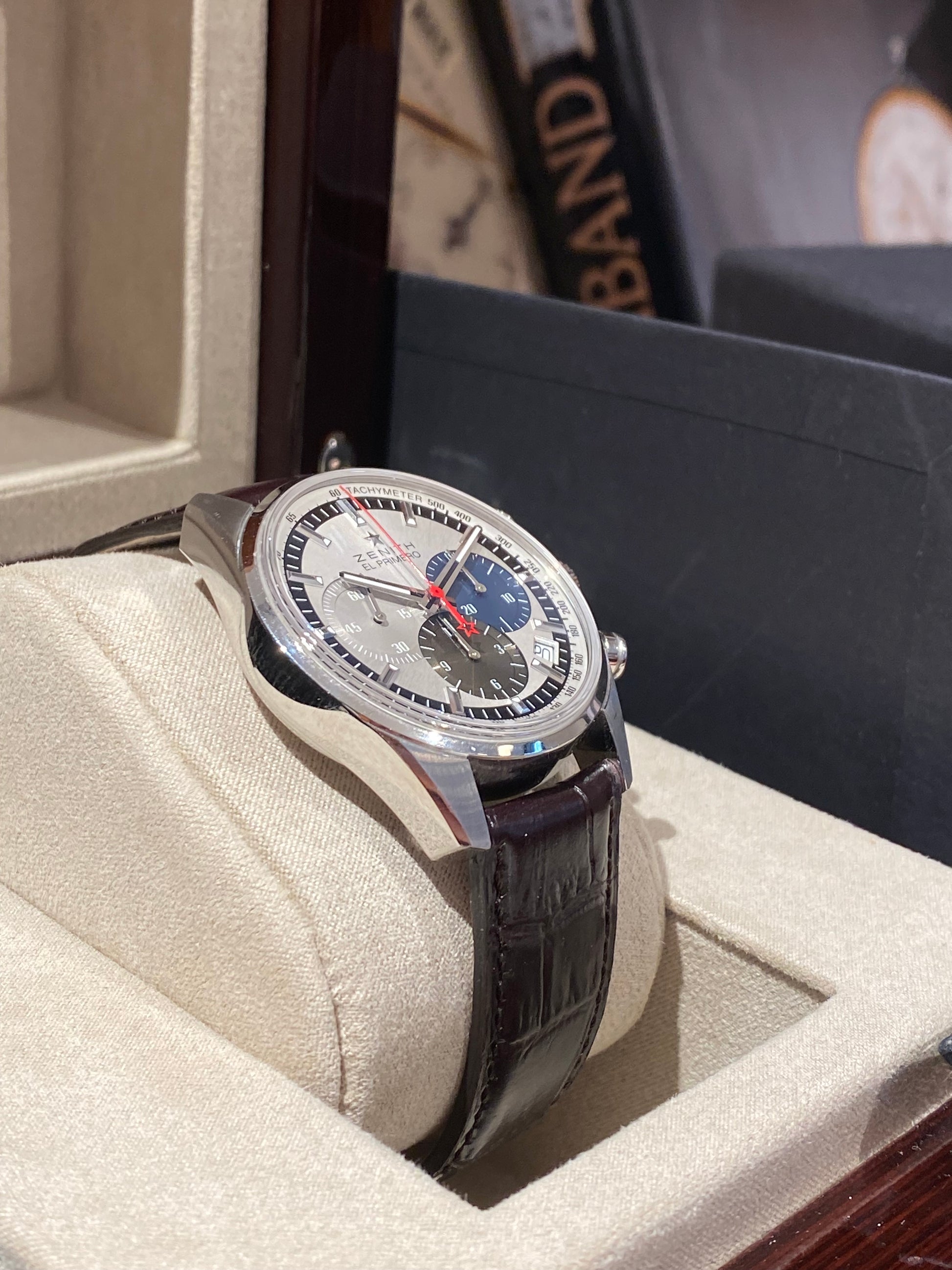 Automatikwerk mit Chronographen und Datum, Zifferblatt silbern/mehrfarbig mit Indexen, Gehäuse Edelstahl auf Lederband mit Faltschliesse original.